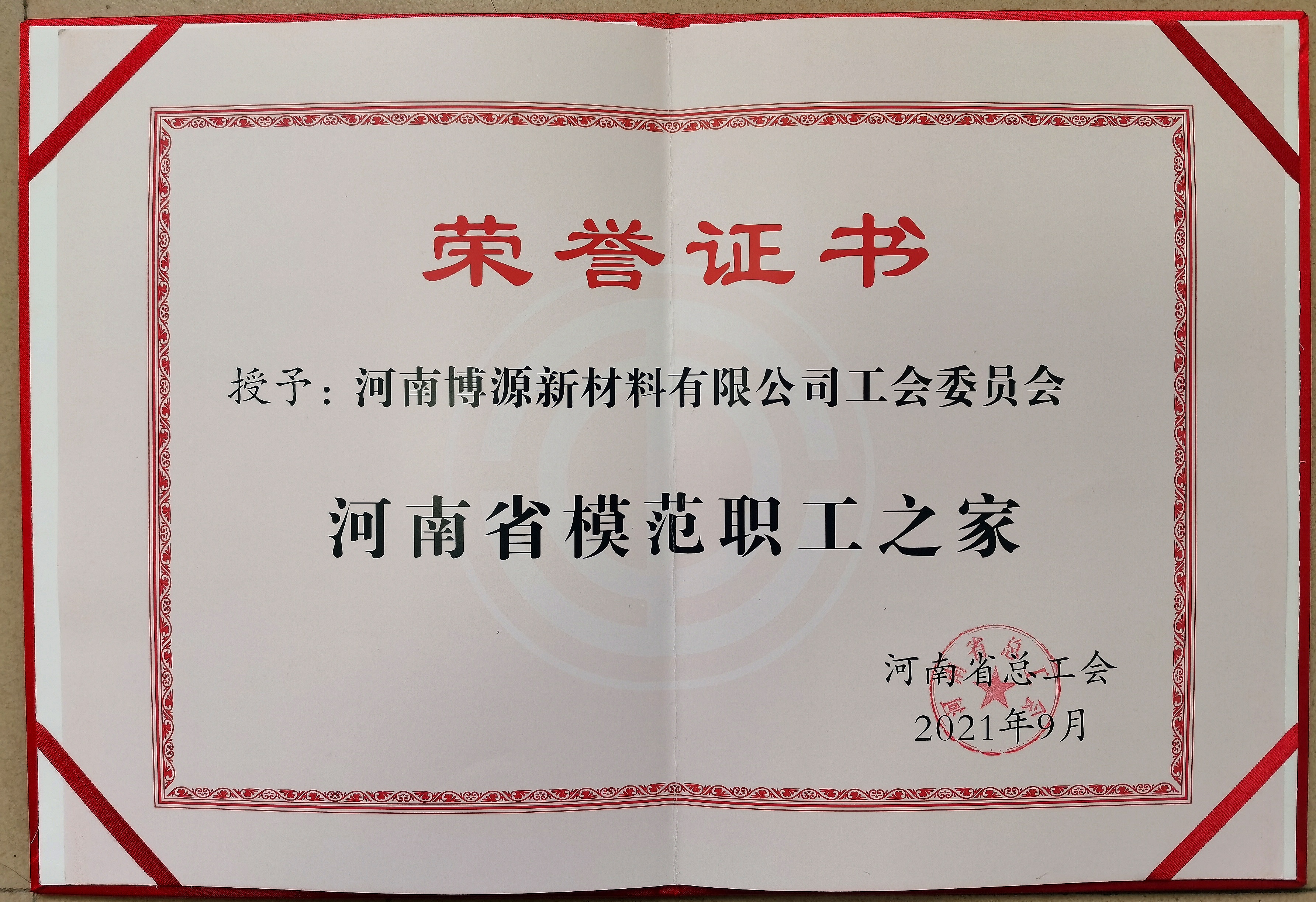 热烈祝贺河南博源新材料有限公司荣获“河南省模范职工之家”和“新乡市基层工会规范化建设示范单位两项荣誉。1月7日上午11:00,新乡县总工会常务副主席程霄鹭、副主席李侠,大召营镇工会主席穆敏、副主席范素云到博源公司向公司工会主席王善智颁发了“河南省模范职工之家”奖牌和证书、“新乡市基层工会规范化建设示范单位”奖牌。